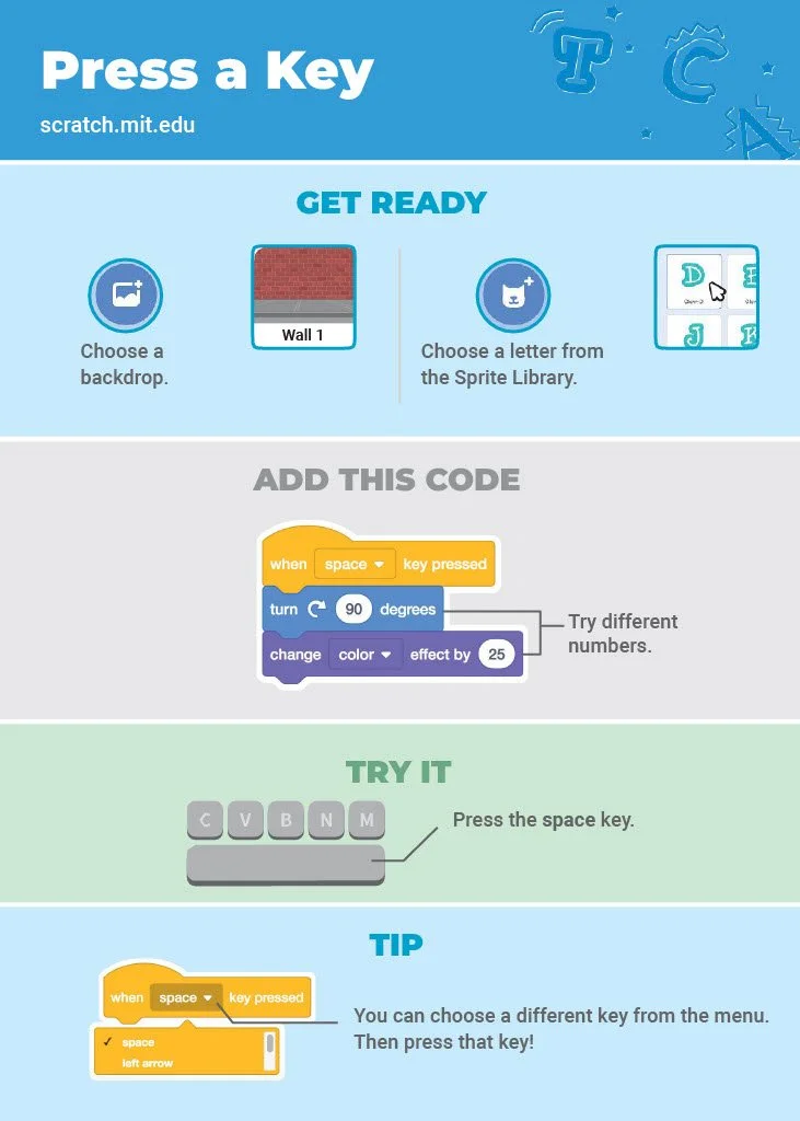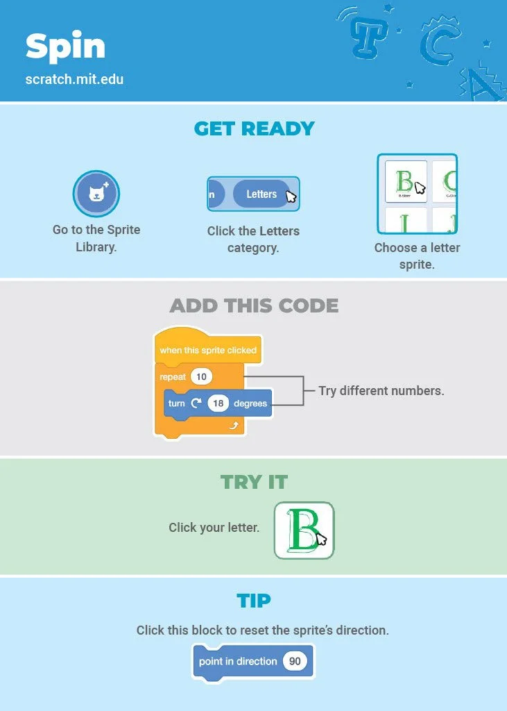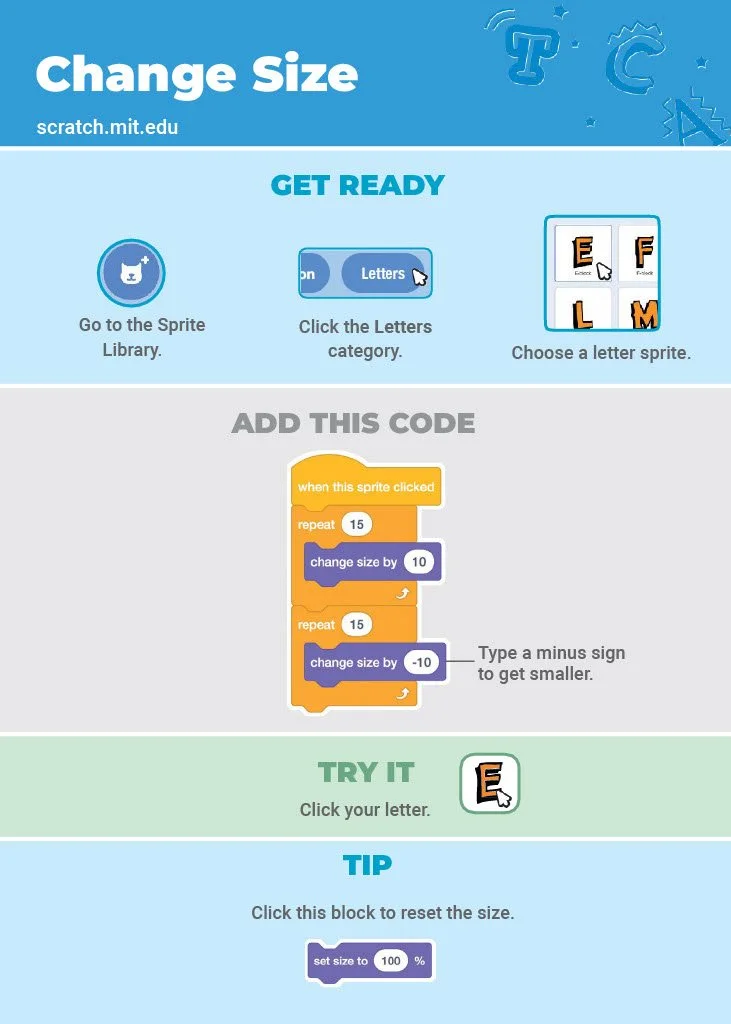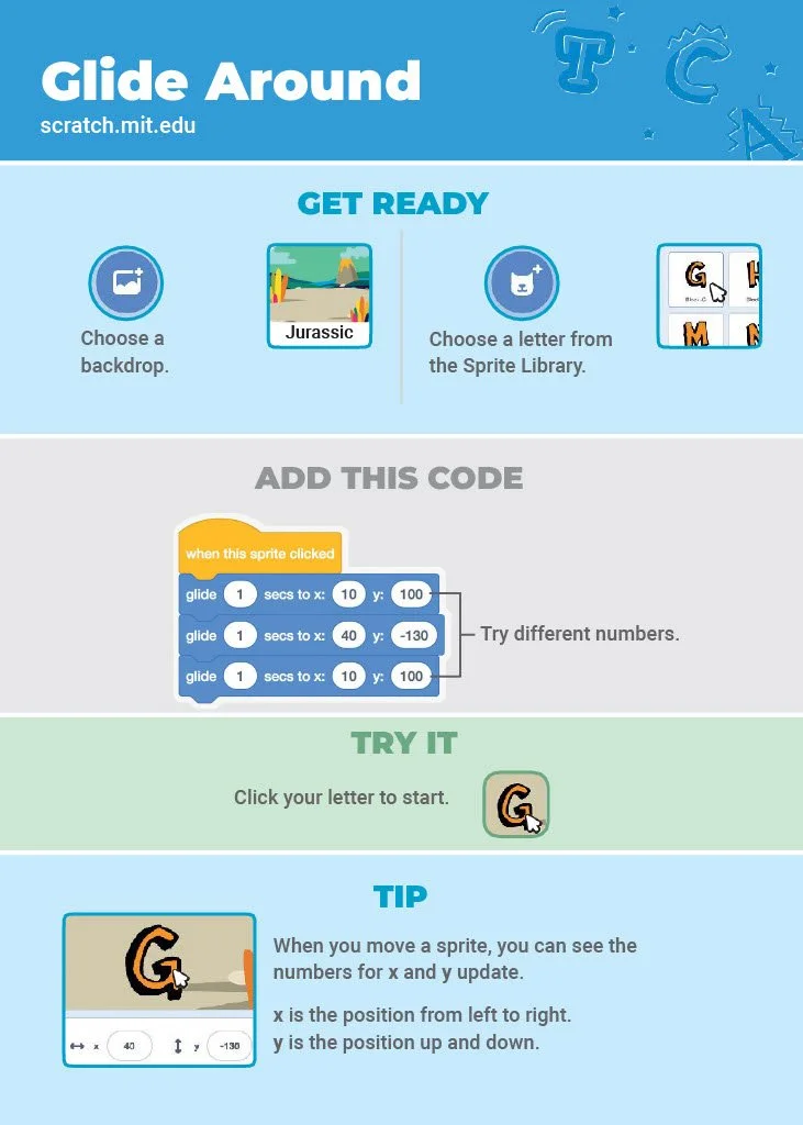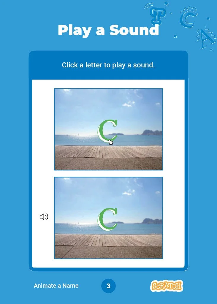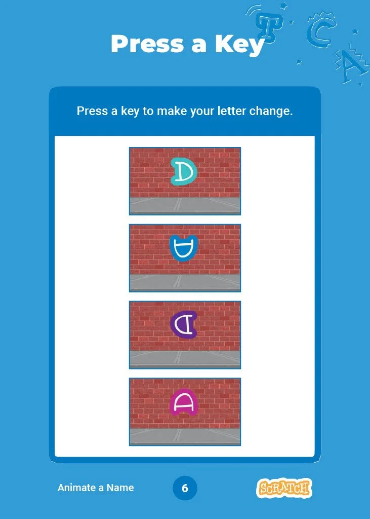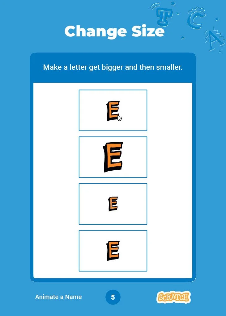 Open the M sprite. Drag the code from the M sprite stage to the first letter of your name. Click the first letter of your name and you will find the code. Then delete the M sprite.