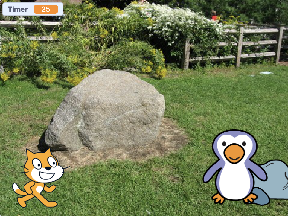 You will be adding a timer and score to your game. The timer will count down from 25. When you reach the penguin, the cat will meow and say, “I Win!"